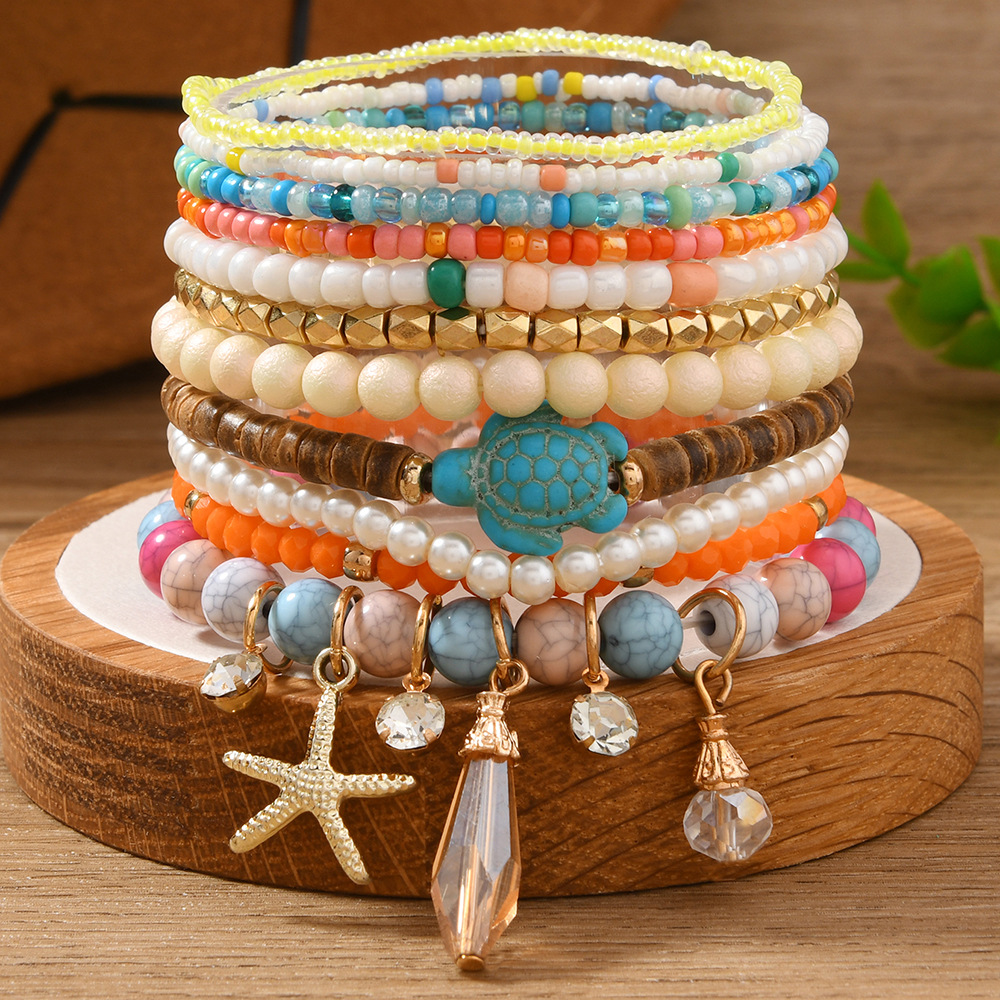 11pc跨境手链欧美波西米亚海滩风蓝金串珠海龟流苏挂件Tiktok爆款