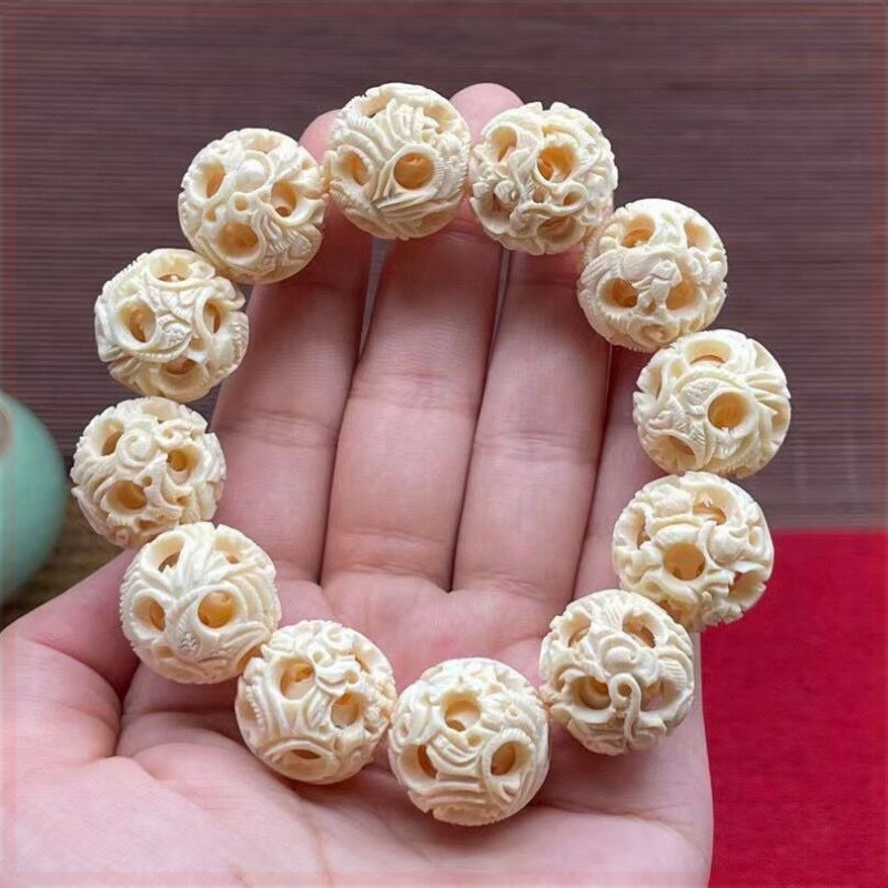 冰料猛犸象牙刻鬼工玲珑球16MM手串文玩配饰猛犸象牙手串艺术金华