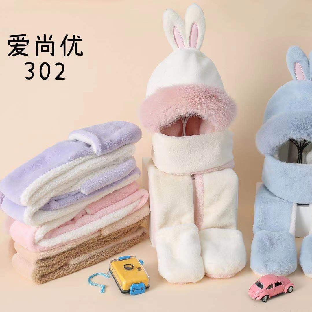 爱尚优可爱兔耳朵帽子女秋冬百搭围脖围巾一体骑车保暖手套三件套