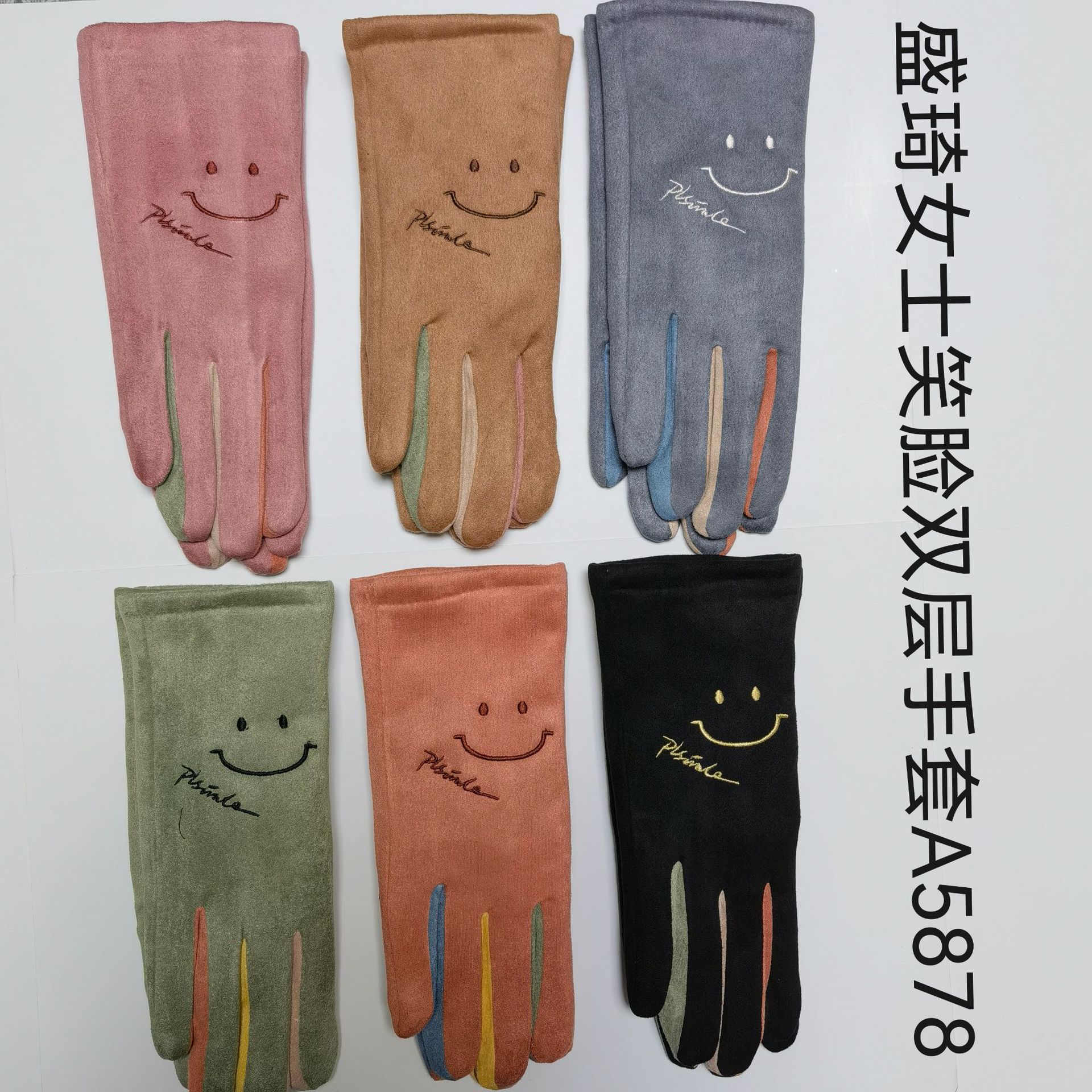 盛琦女士笑脸麂皮绒双层加绒加厚冬季保暖手套户外骑行防风防寒手