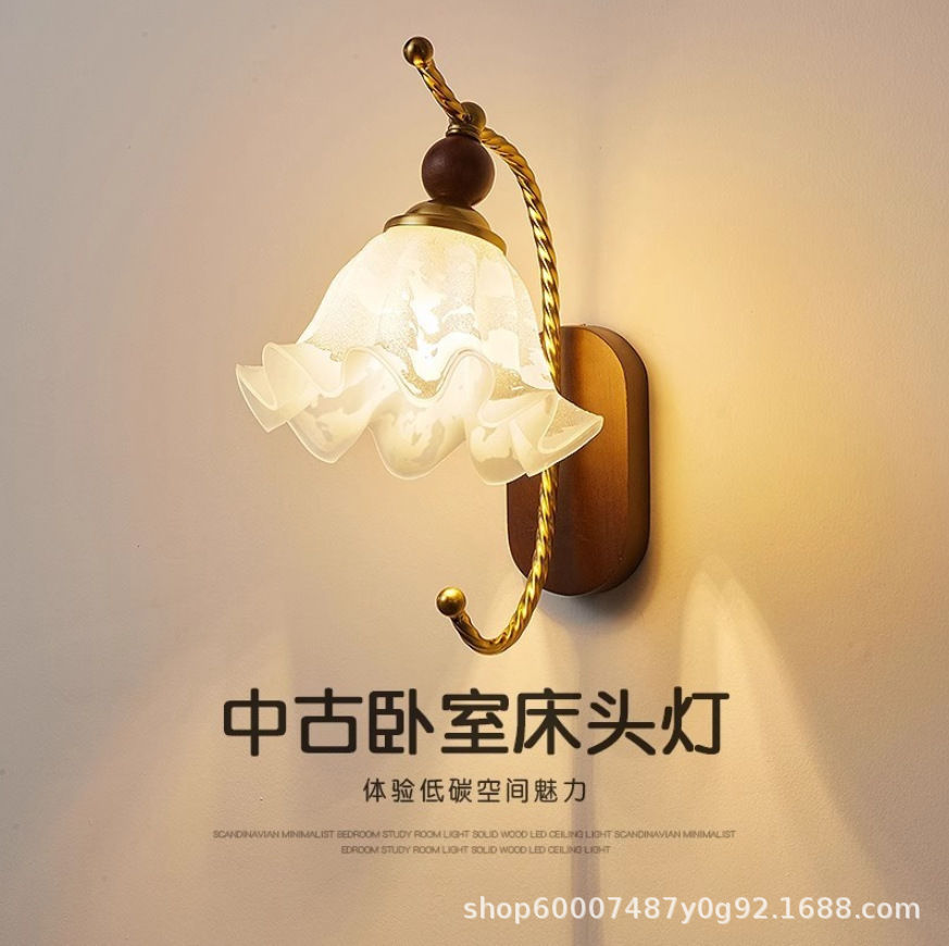 中古风客厅壁灯法式复古胡桃木玻璃高级温馨卧室床头走廊过道灯具