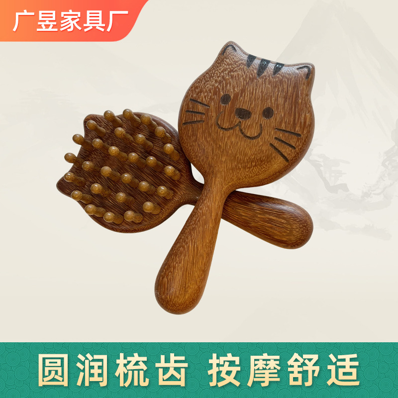 龙凤檀插齿小猫钉钉梳头部经络疏通按摩梳批发儿童卡通实木小猫梳