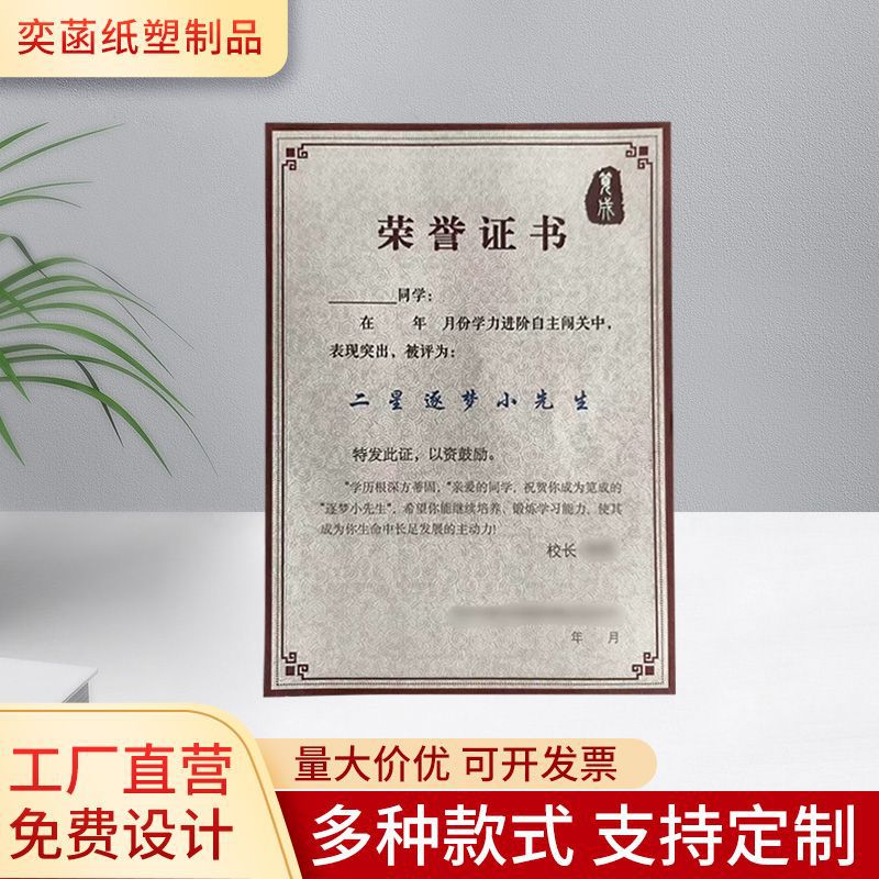 厂家荣誉证书封皮A4单面式聘书结业证书授权捐赠奖状内页印刷打印