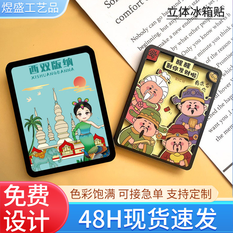 文创国潮木质3d立体冰箱贴旅游景区纪念品木质压纹财神西双版纳定