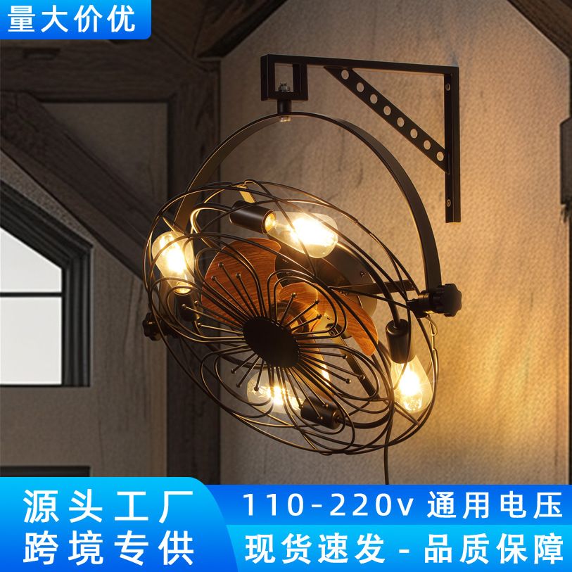 跨境外贸美式壁挂风扇灯复古铁艺墙壁风扇笼子卧室餐厅110v吊扇灯