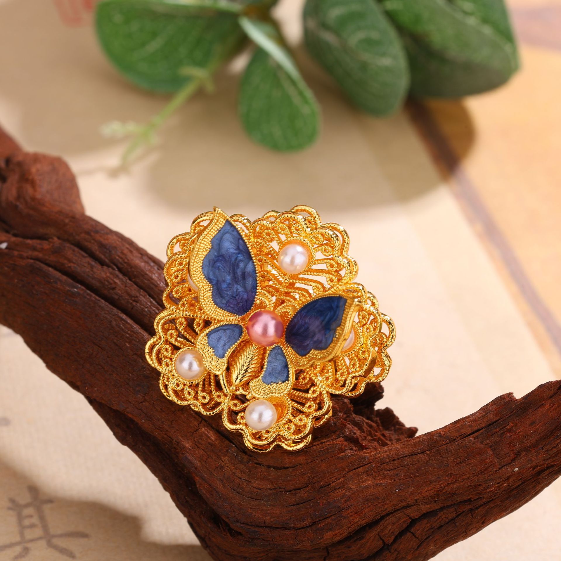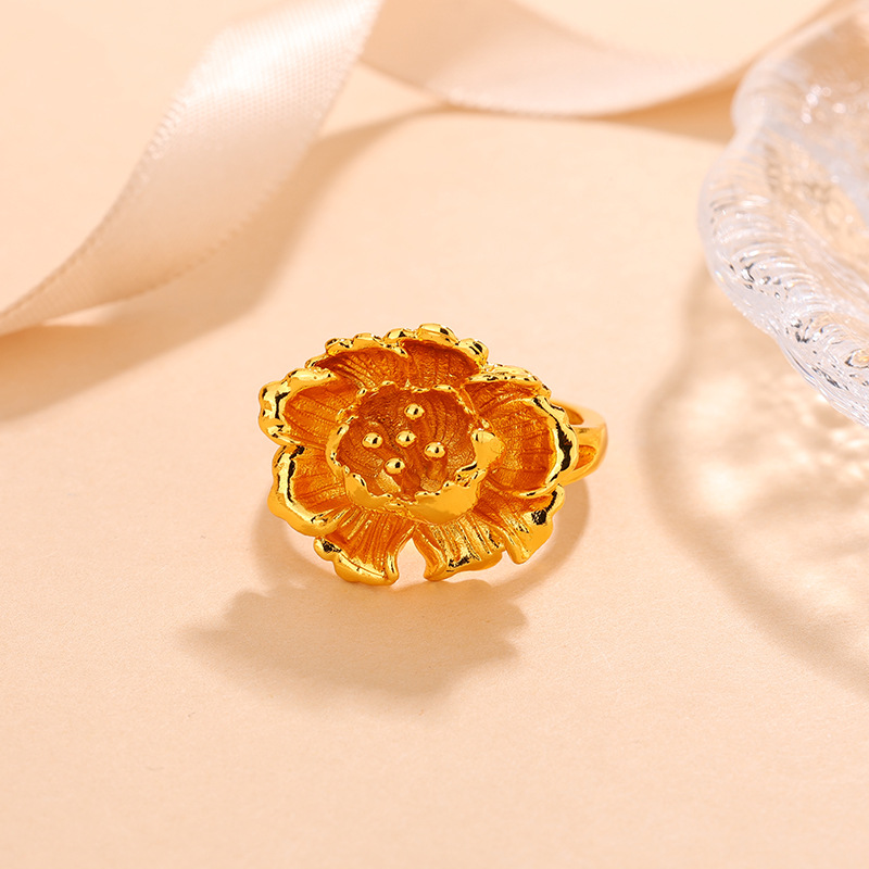 小红书高颜值古法金色鎏彩牡丹戒指 复古金冠群芳中国风百搭女戒